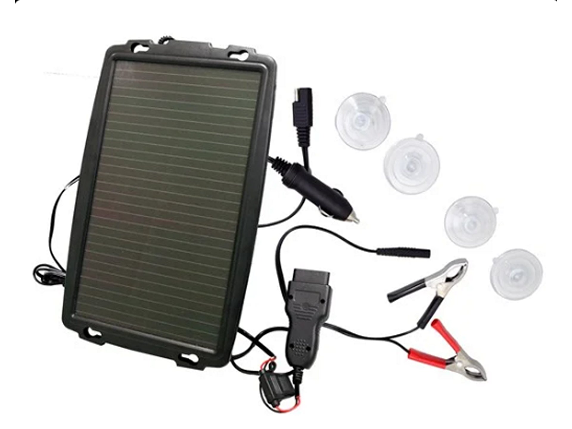 - Beinhaltet: 12-Volt-Gleichstromstecker, Krokodilbatterieklemmen, Saugnäpfe zur einfachen Befestigung des Solarpanels an der Windschutzscheibe des Fahrzeugs und OBD2-Anschluss
